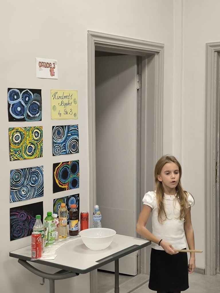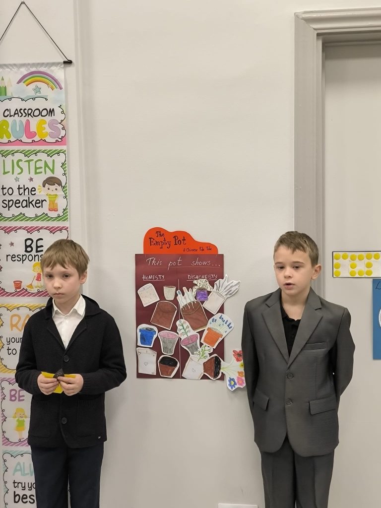 During the assembly, students shared stories, science experiments, and creative projects that highlighted key ideas about kindness, honesty, responsibility, cooperation, and healthy living.
